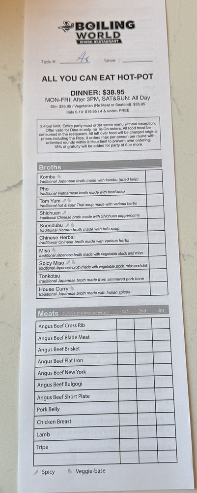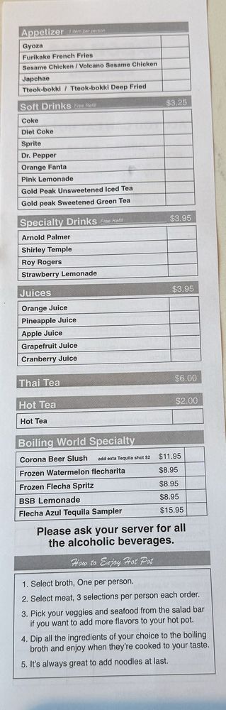 Boiling World is a Chinese hot pot restaurant located in Ontario, CA, offering a variety of options for a unique dining experience. With features like vegan and vegetarian options, wheelchair accessibility, and a full bar, it caters to a diverse range of preferences. Customers rave about the attentive service, cleanliness, and consistently good food. The buffet-style setup allows for customization with a wide selection of meats, veggies, and sauces. The spacious interior and efficient staff create a pleasant atmosphere for enjoying your meal. Prices are around $38 per person, but the quality and quantity of food justify the cost. Overall, Boiling World stands out for its extensive menu, top-notch service, and satisfying dining experience.